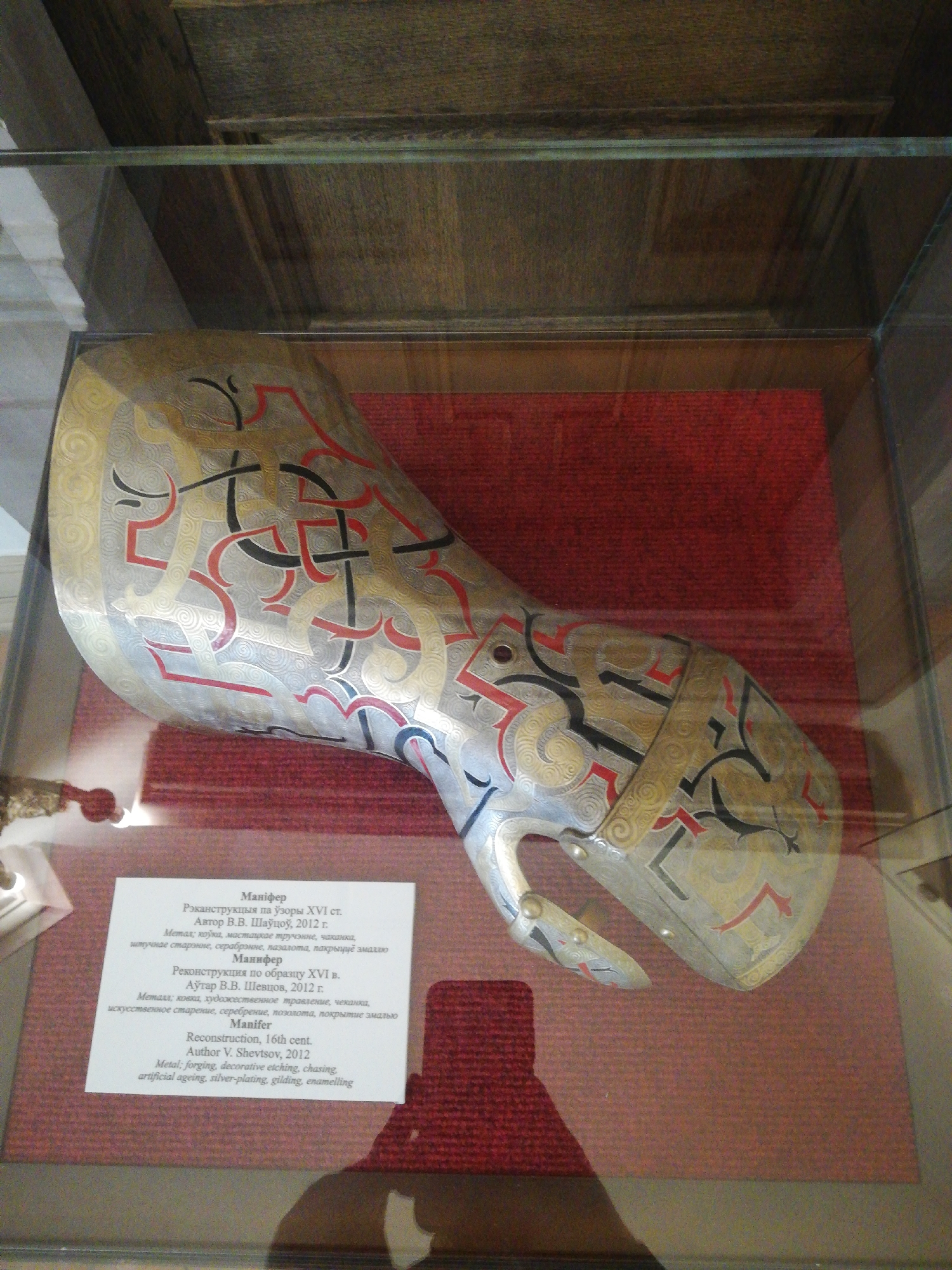 A reconstructed 16th-century "Manifer" (gauntlet) is displayed within a glass exhibition case in a museum setting at the Mir Castle Complex, Мірскі сельскі Савет, Belarus. The metal gauntlet, crafted by V.V. Shevtsov in 2012 using forging, decorative etching, chasing, artificial aging, silver-plating, gilding, and enamelling, features intricate red and black enameled patterns over a gilded and silver-plated surface with etched spiral motifs. It is positioned at an angle, resting on a textured reddish-brown fabric background. A white rectangular information label in Belarusian, Russian, and English, detailing the artifact's reconstruction, author, and materials, is placed in front of the gauntlet. A faint, distorted reflection of a person's upper body is visible on the lower right glass panel of the display case. The background above the exhibit appears to be dark, possibly wooden.