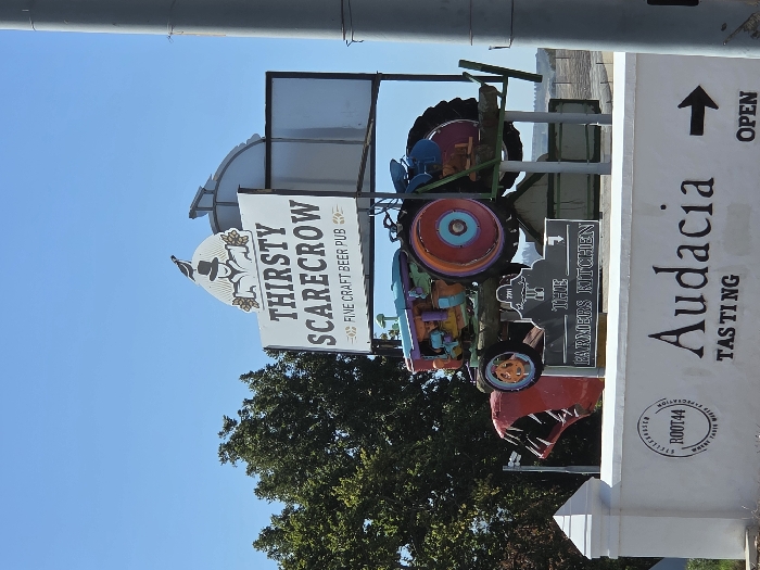 The image depicts an outdoor scene in the Stellenbosch Local Municipality, South Africa, featuring multiple signs and a colorful tractor display under a clear blue sky. In the foreground, a white stucco wall extends horizontally. On its left, a circular black logo reads "STELLENBOSCH ROOT44 WHERE TASTE MEETS EXPECTATION." To the right, large black text spells "Audacia," with "TASTING" directly below it. Further right, a black arrow points right, accompanied by the word "OPEN." Above the wall, a prominent signage structure is visible. A large white rectangular sign with brown lettering displays "THIRSTY SCARECROW" and "FINE CRAFT BEER PUB," flanked by hops illustrations. Perched atop an arched scarecrow emblem above this sign is a small, dark bird. Below the "Thirsty Scarecrow" sign, a vintage-style tractor, painted in a vibrant, multi-color scheme (including blue, pink, orange, green, yellow, purple, and red), is mounted horizontally on a wooden structure. Below and to the left of the tractor, the red front section of another vehicle is visible. Below the tractor, a dark, shaped sign reads "THE FARMERS KITCHEN" in white text, with an emblem featuring a silo-like structure and the year "2011" above it. To the left of the signage, green trees are prominent. To the far right, a thick, grey utility pole runs vertically. In the distant background, beyond the signs and trees, a light-colored, arid-looking landscape of fields or hills stretches under the bright blue sky. No individuals are present in the scene.