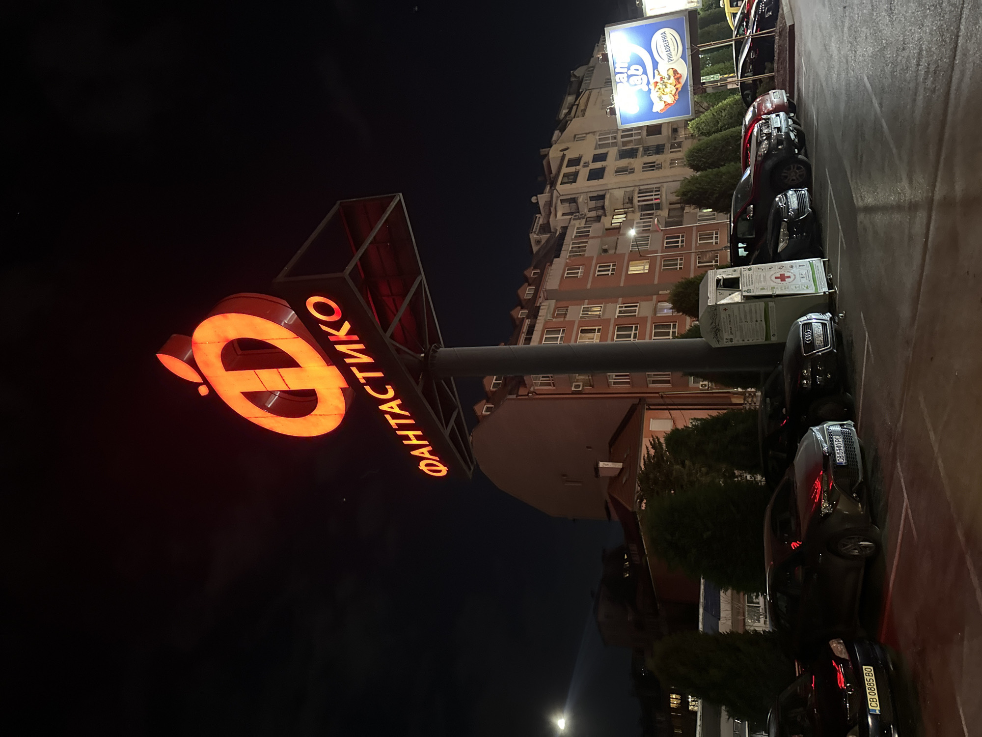 This is a nighttime image captured in a commercial area of Sofia, Bulgaria