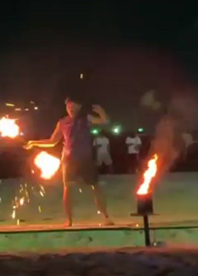 A man is performing fire tricks on a beach at night. He's standing on a low, wooden stage and wearing a tank top and shorts. He is holding two flames in his hands, which he swings around as part of the performance. There is also a fire burning from a stand to his right. There are a few other people in the background. The scene is lit by the flames, and the ambient light is dark.