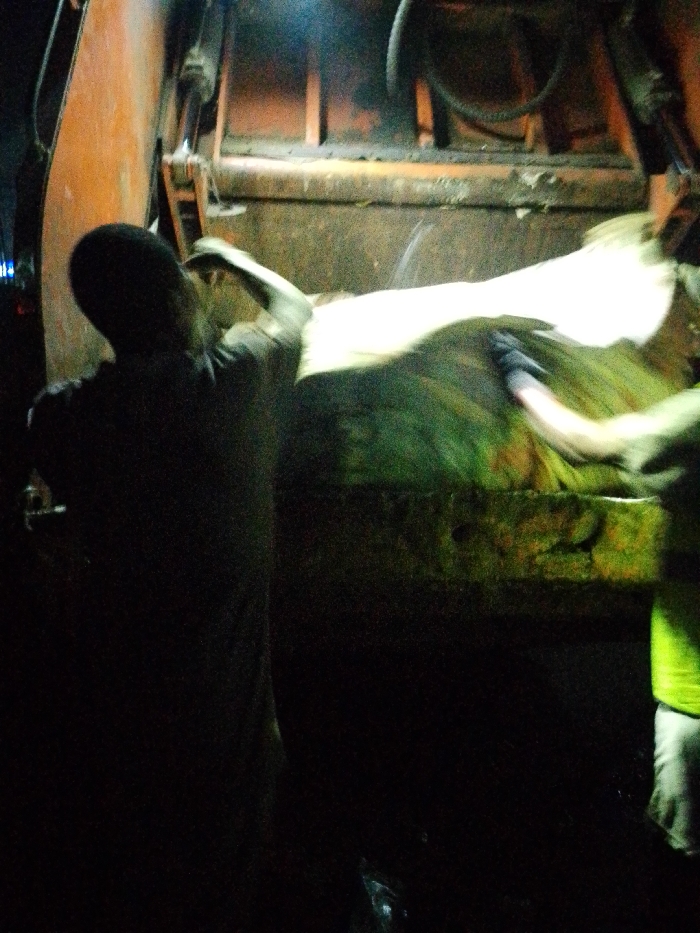 - "In a low-lit scene, two sanitation workers handle refuse within a large orange garbage truck" by FM-vzzmY2, licensed under CC BY 4.0