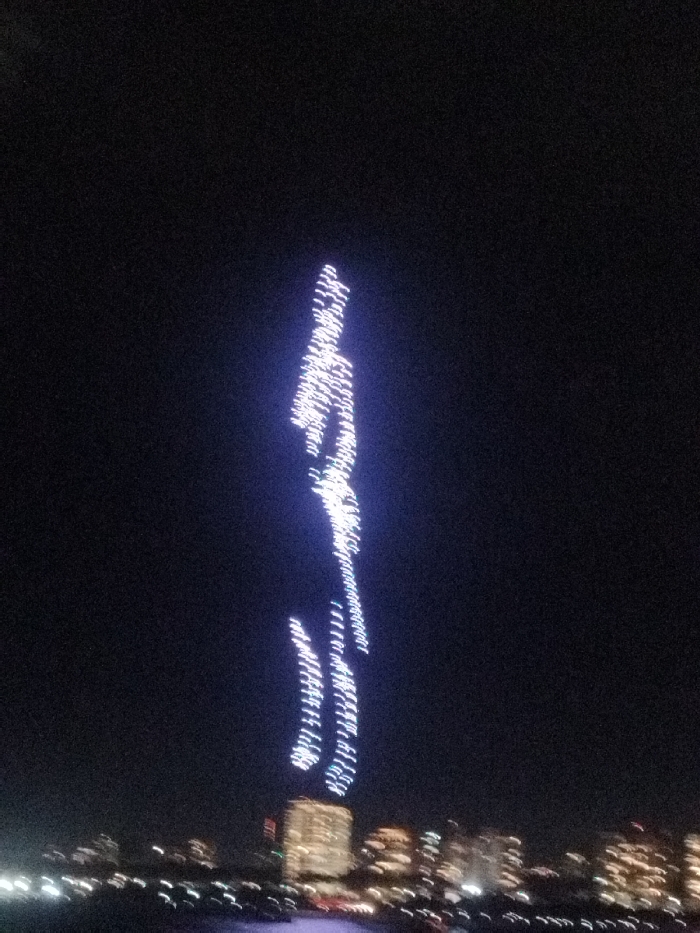 - "At night, a blurred cityscape sits at the bottom of the frame, topped by a dark sky where a vertical, luminous, elongated human-like shape is formed by clustered lights" by FM-b3qRJ3, licensed under CC BY 4.0