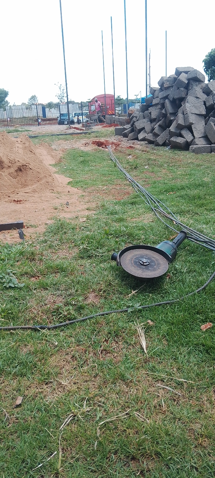 This image depicts a construction site in Gatongora ward, Kenya, viewed from a low angle. The foreground consists of patchy green and dry grass. An angle grinder with a circular cutting disc is positioned on the grass, connected to a black electrical cable. Several lengths of rebar are laid horizontally on the grass, extending towards the midground. To the left, a mound of light brown sand is visible. Further back, on the right, a large pile of grey, rough-hewn stone blocks is present. Between the sand pile and the stone blocks, sections of reddish-brown soil are exposed. In the background, an individual wearing a light-colored shirt and headwear is pushing a wheelbarrow near a red shipping container. Multiple tall, slender metal rods (likely rebar) are erected vertically. Beyond the immediate construction area, a metal fence, several parked vehicles (including a dark sedan), and distant trees are visible under a bright, overcast sky.