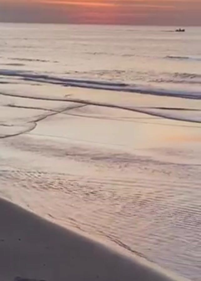 calm beach at sunset. The sky is a blend of orange and pink. The ocean is smooth with small waves gently rolling onto the shore. A small boat is visible on the horizon. The sand is wet and reflects the colors of the sky. Large rocks are in the foreground. No people are visible.