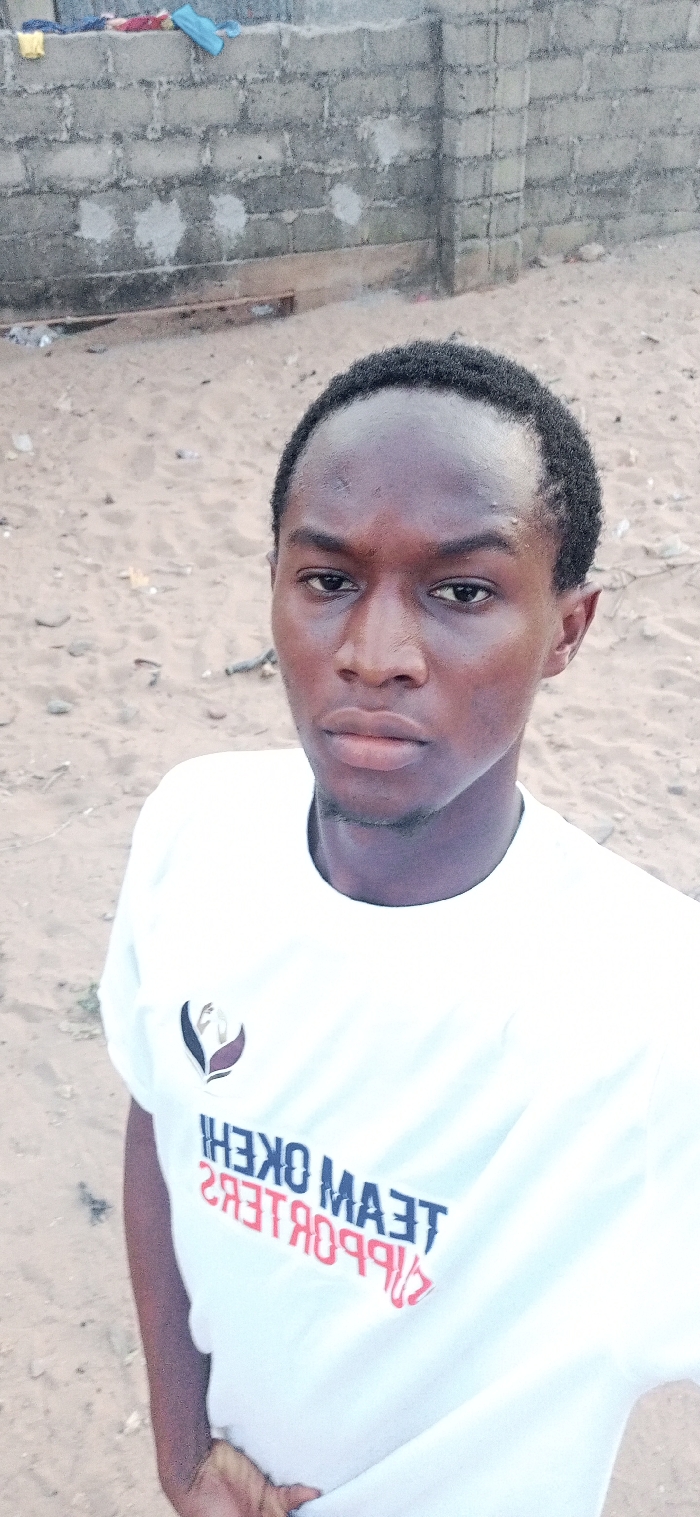 A young Black man takes a selfie outdoors. He has short, dark hair and a serious expression. He wears a white t-shirt with a logo and text: "TEAM OKEHI SUPPORTERS" printed backwards on it. The background shows a sandy ground and a cinder block wall. The lighting is overcast, and the image appears to be taken during the day.