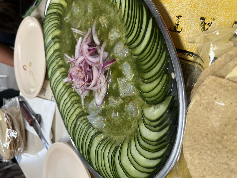 - "An oval, metallic platter containing aguachile is positioned on a yellow and black patterned table surface in Mexico City, Mexico" by FM-lAJLT2, licensed under CC BY 4.0