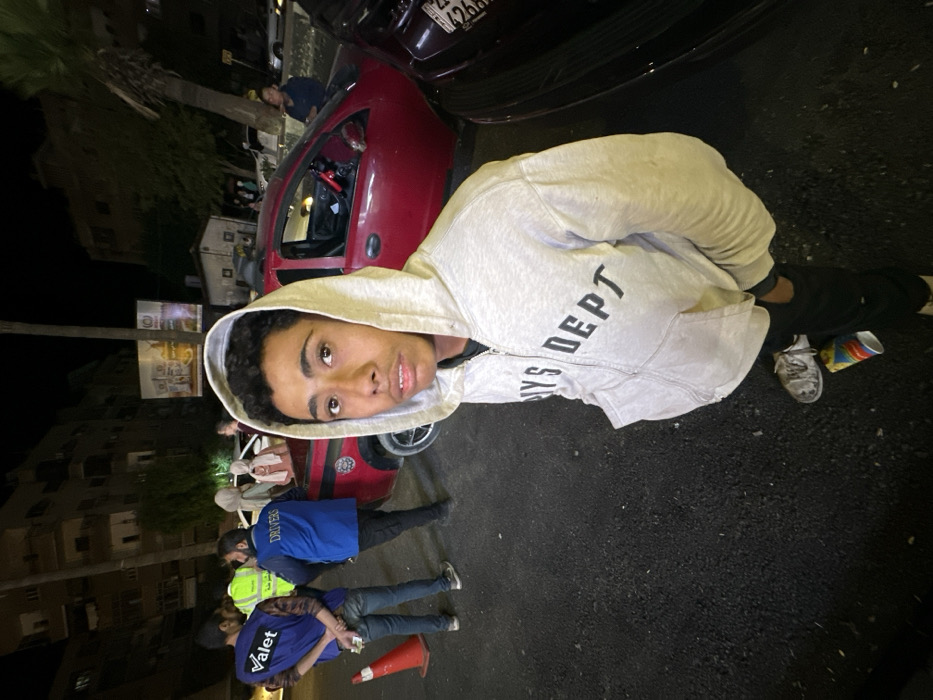 A nighttime street scene in Barza Municipality, Syria, depicts multiple individuals and vehicles under artificial lighting. In the immediate foreground, a young male with dark, curly hair and a light complexion stands facing the camera. He wears a light grey hooded zipper jacket with "DRYS DEPT" text on the chest, black pants, and white sneakers, with his right hand in his pocket. A discarded colorful disposable cup is visible on the dark asphalt near his right foot. Behind the foreground subject and slightly to the left, a red two-door vehicle, possibly a pickup truck or small SUV, is parked or stopped with its driver's side door open, revealing a red steering wheel with a cover. Near this red vehicle, two men wearing blue vests are present: one with "Valet" printed on his back, holding currency or papers behind him, and another with "DRIVERS" printed on his back. Both are partially obscured and appear to be facing other individuals near the red vehicle, including a woman in a light-colored head covering and another person in a pink top. An orange traffic cone stands on the ground to the left of the "Valet" individual. To the right of the foreground subject, a portion of a dark-colored vehicle is visible, displaying a license plate with digits "4266". The background features multi-story buildings, typical of an urban environment, and a prominent illuminated billboard displaying food advertisements. Streetlights and sparse vegetation, including palm trees, are also visible. The ground is paved asphalt.