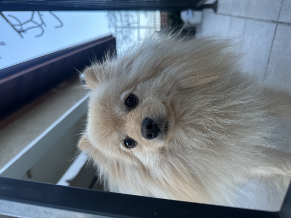 - "A light-beige Pomeranian dog with dark eyes and a black nose is positioned centrally, looking directly forward" by FM-j5HwN2, licensed under CC BY 4.0