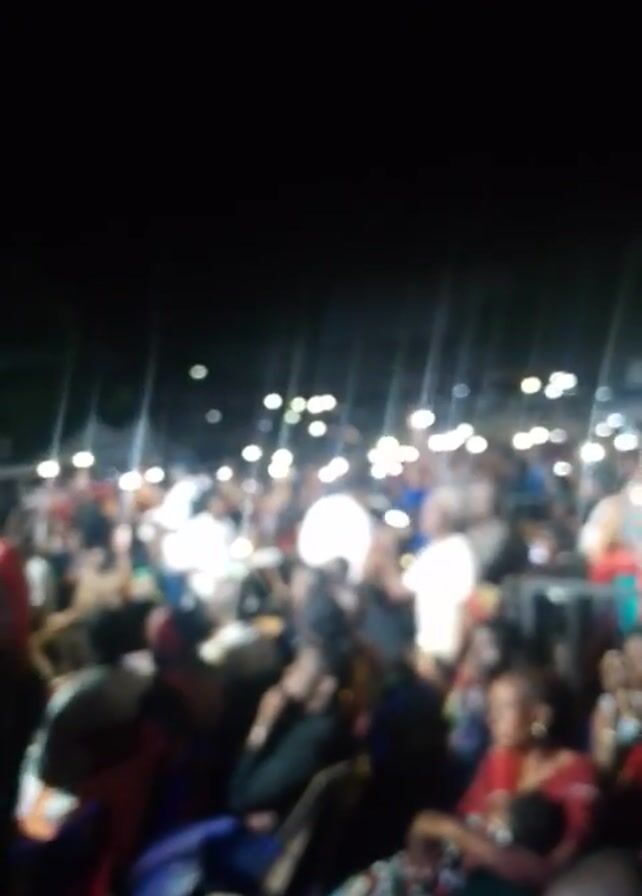 crowd of people, likely at an outdoor event or concert at night. Most people are standing and appear to be enjoying the music or performance, as some are raising their hands and moving. The lighting is predominantly from overhead lights, creating bright spots against the dark background. A white tent can be seen on the left. The video is slightly blurry.