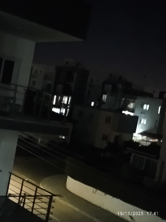 The image presents an elevated, nighttime or late dusk view of an urban residential area in Nicosia, Northern Cyprus / Cyprus. The scene is dated 15/11/2025 at 17:41, as indicated by a digital timestamp. In the immediate foreground on the left, a partial white building structure, likely a balcony, features a dark metal railing and multiple parallel clotheslines extending horizontally. Below this, a curved, illuminated paved road or street is visible, bordered on its right by a low, white concrete wall. The background consists of a cluster of multi-story buildings, ranging from two to four stories, predominantly dark against the slightly lighter, dark sky. Several windows within these buildings emit artificial light, indicating interior illumination. No individuals are visible within the frame, and no specific actions or interactions are depicted. The environment is characterized by urban infrastructure and artificial lighting during the evening hours.