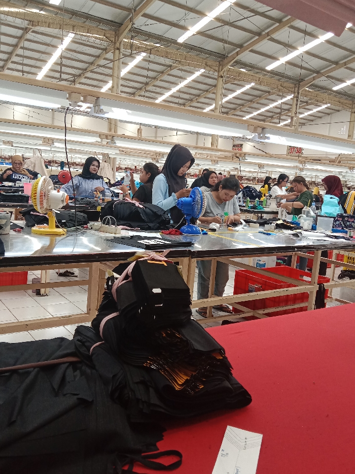 Inside a large factory, workers are stationed at long tables, engaged in detailed work. The facility's roof structure features prominent metal support beams and bright lighting. Small personal fans provide some comfort to the workers. On a red-covered table in the foreground, neatly stacked black materials suggest part of the manufacturing process. The overall scene depicts a busy, large-scale production environment.