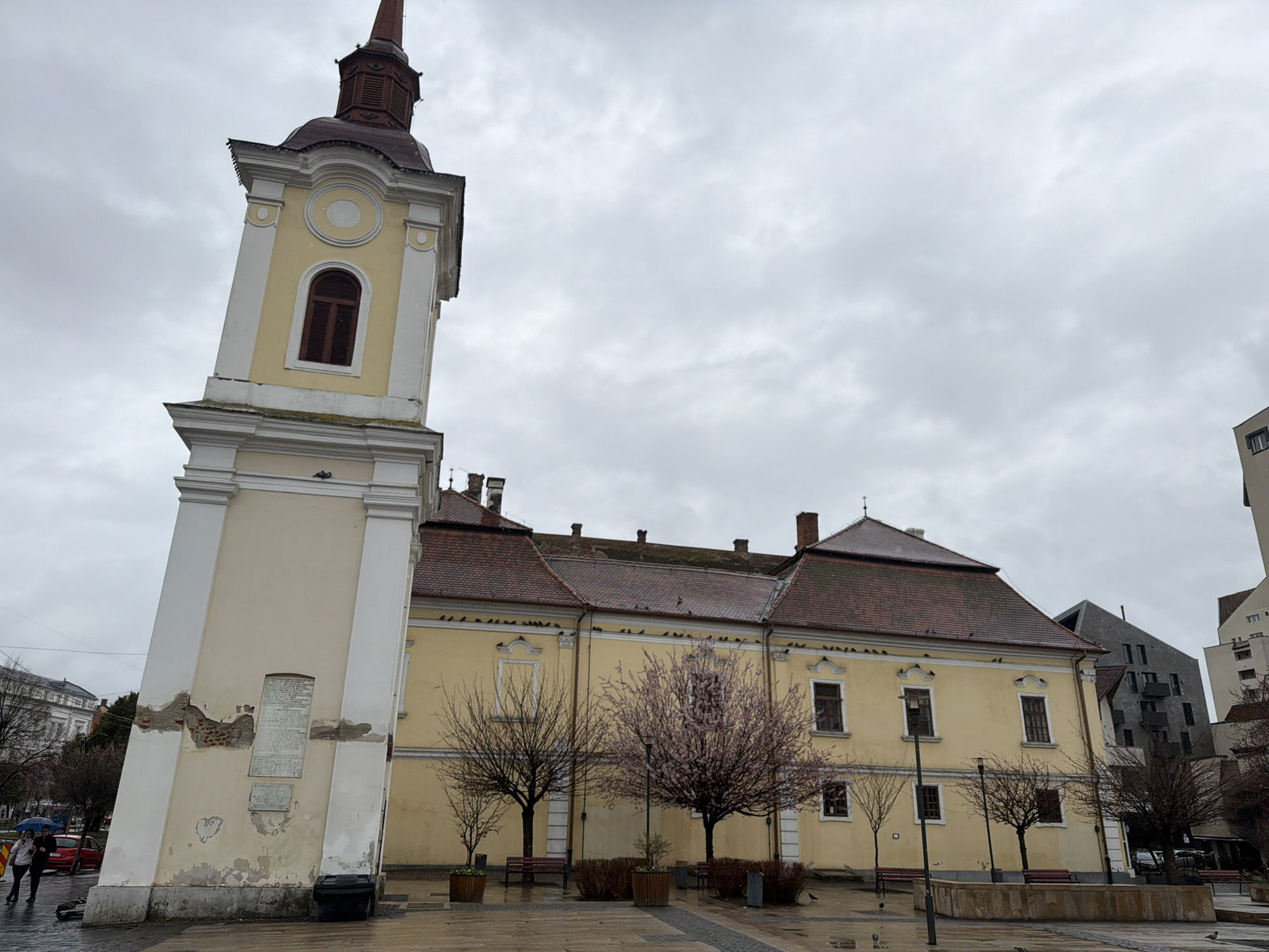 The image depicts a view of the Teleki House in Târgu Mureș, Romania, distinguished by its baroque architecture and adjacent leaning tower. The main building is a yellow two-story structure with a red-tiled roof. Trees are planted in front of the building, some with budding pink blossoms. The tower is a cream-colored structure with a brown-topped spire and noticeable deterioration near its base, including exposed brick and plaques. A trash receptacle sits near the tower's base. The foreground consists of a wet paved area, indicating recent or ongoing rain. In the background, modern buildings contrast with the historical architecture. Several birds can be observed perched on the roof and ledge of the Teleki House. Pedestrians can be seen in the distance, some carrying umbrellas. The sky is overcast, contributing to the subdued lighting of the scene.