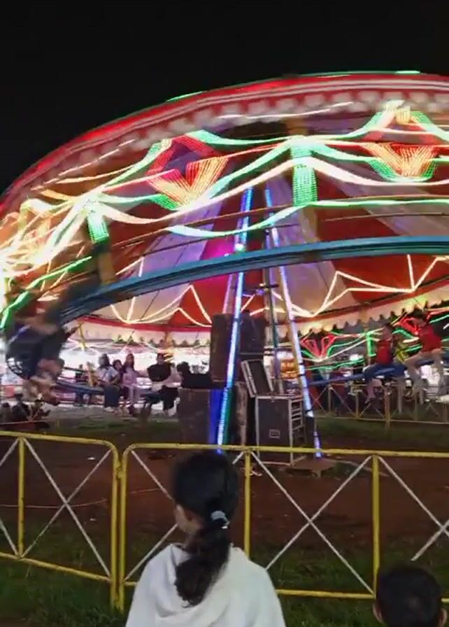 At night, in what appears to be a carnival or fairground setting, the camera captures a vibrant carousel in motion