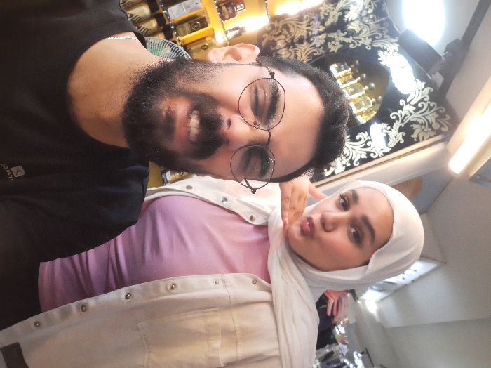 This image depicts two individuals posing for a photograph inside a retail establishment, likely a perfume shop, in Barza Municipality, Syria