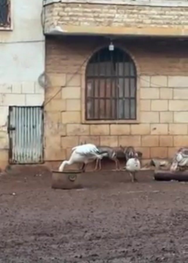 muddy yard with several turkeys and two small deer. A white turkey drinks from a metal container. Two deer stand near a brick building with arched windows. Other turkeys are on the ground and near a log. The building is aged, with signs of wear and tear. The ground is dark and muddy. A metal gate is visible on the left side of the frame.