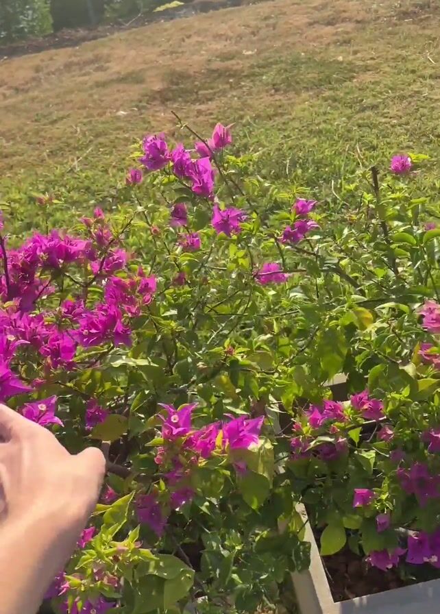 A person's hand briefly enters the frame and touches a purple bougainvillea bush, then moves away