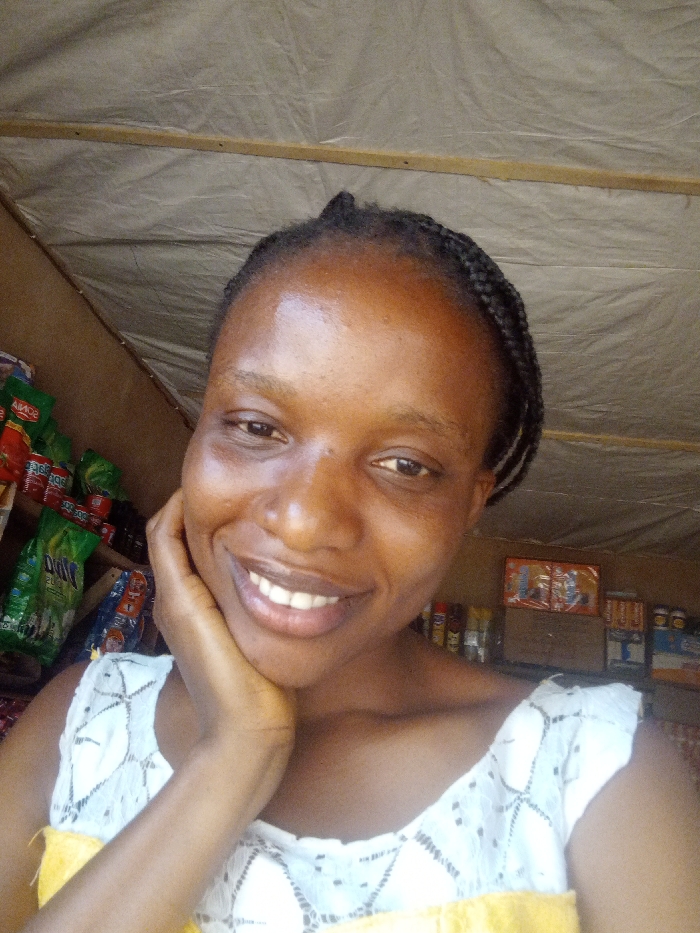 A dark-skinned female subject, with braided hair pulled back, is depicted in a close-up portrait, smiling directly at the camera. Her right hand is positioned against her jawline. She is wearing a white sleeveless top with a prominent yellow band at the lower edge. The background indicates an indoor retail environment, consistent with a small shop or stall located in Nsukka, Nigeria. Shelves behind her display various packaged goods; specifically, red and green packages are visible on the left, with partially legible text including "SOMIA" and "DUDU". On the right, additional shelves hold assorted bottles and packages. The ceiling is constructed from a light-colored, possibly fabric or corrugated, material supported by exposed wooden beams.