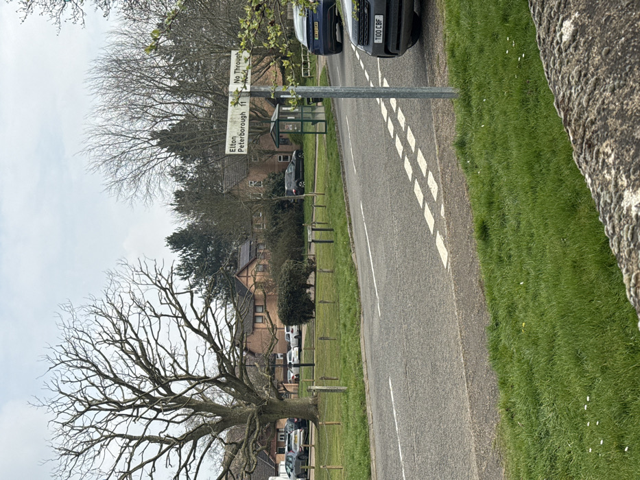 The image depicts a street scene in Warmington, United Kingdom, under an overcast sky. A low, moss-covered stone wall runs across the immediate foreground, topped by green grass with scattered white flowers. An asphalt road occupies the lower midground, featuring a solid white edge line and double white dashed center lines. On the right, a silver pole supports two white rectangular road signs. The upper sign displays "Elton" and "Peterborough 11". The lower sign, angled to the right, reads "No Through Road". A dark blue SUV is partially visible behind the pole, and a grey Land Rover, registration T100 CBF, is partially visible in front of the pole on the road's shoulder. To the left of the road, a broad green grassy area is delineated by a series of short wooden posts. A dark green bus stop shelter with a lighter roof is situated within this grassy area to the left of the road signs, flanked by a dense, trimmed hedge. In the background on the left, a large, bare deciduous tree with extensive branching stands prominently. Behind it, and across the central background, are several brick residential buildings with dark roofs, some featuring dormer windows. Multiple parked vehicles (white, grey, black) are visible near these structures. Additional bare and evergreen trees populate the wider background. No persons are depicted.
