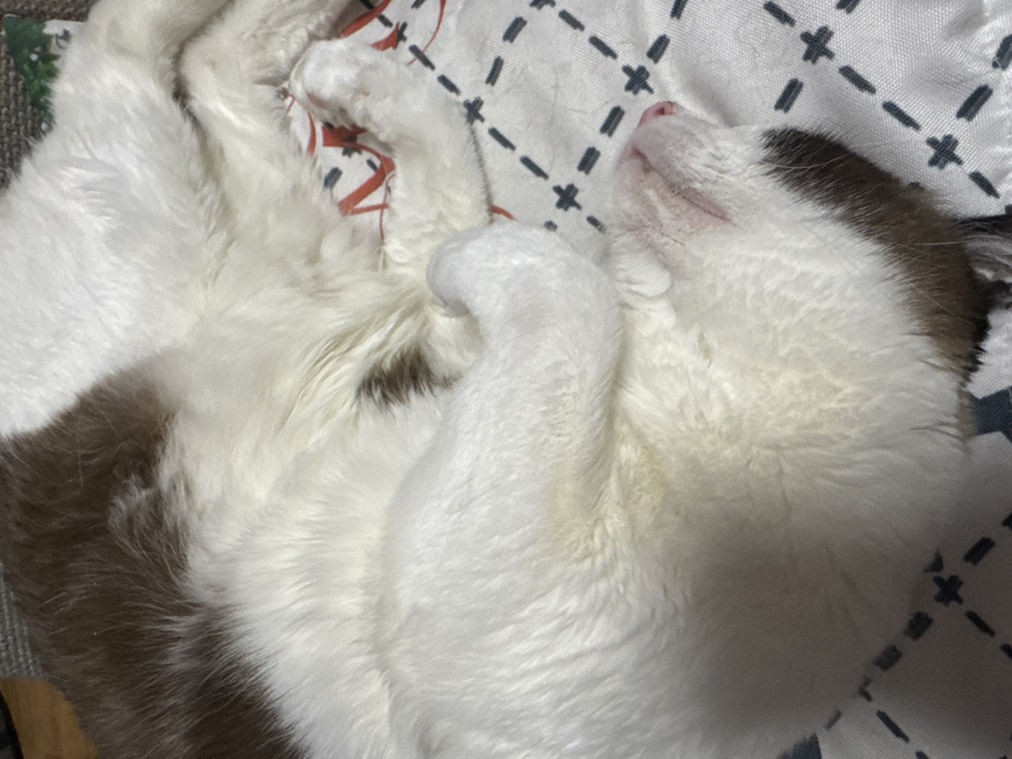 A domestic cat, predominantly white with irregular brown patches on its back and head, is depicted sleeping on its side