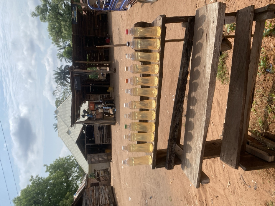 The scene is set in Okura, Nigeria, under a bright, partially cloudy sky. In the foreground, eleven transparent plastic bottles, each filled with a pale yellow liquid, are displayed in a linear arrangement on the top tier of a rustic, multi-tiered wooden stand. The bottles feature varied cap colors including white, green, orange, black, and red. Shadows from the bottles and the stand are cast onto the lower tiers and the reddish-brown earthen ground. In the midground, a collection of single-story, rudimentary structures constructed from wood planks and corrugated metal roofing frames an unpaved area. To the left, a small, log-cabin-style building stands. Centrally, a larger building with a white corrugated metal roof and wooden walls is visible. To its right, two adjacent open-front stalls feature wooden frames and corrugated metal roofs. A sign above the left stall identifies it as "ELECTRICIAN," while a partial sign above the right stall begins with "ONOMU MOTOR..." Several indistinct individuals are present within or near these stalls, suggesting activity. A blue three-wheeled vehicle is partially visible on the far right. The background features dense green foliage, including palm trees.