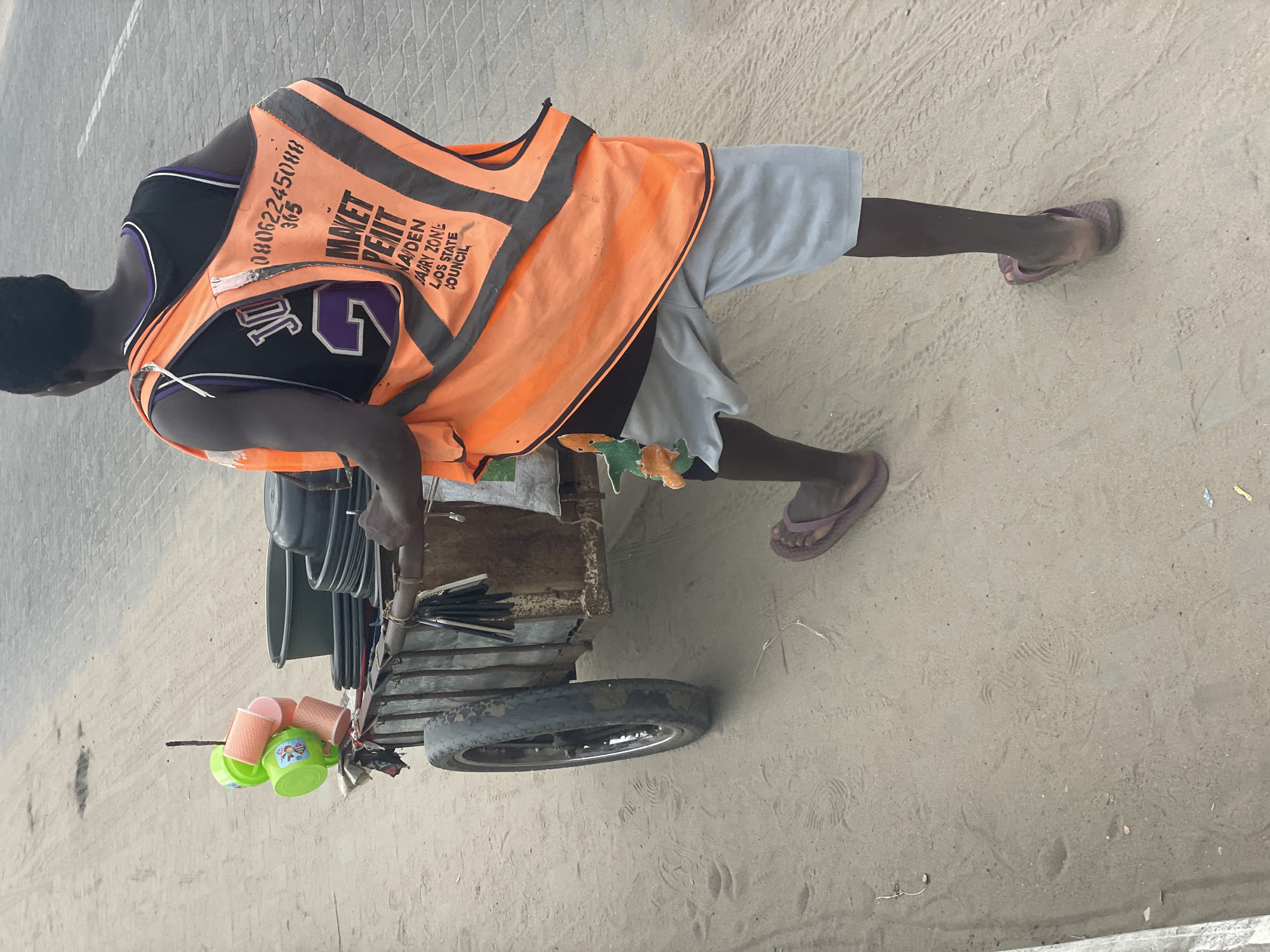 A man stands in an urban environment, possibly in Badagry, Nigeria, wearing a basketball jersey, gray shorts, and an orange traffic safety vest labeled "Market Department, Maiden, Ajeromi Ifelodun, LGA State Council." He wears flip-flops on his feet. He is positioned next to a small wheeled cart carrying several black pots and cups. The cart has an old, worn tire. Several colorful plastic cups hang from the side of the cart. The ground is rough and uneven, possibly a dirt or sandy surface.