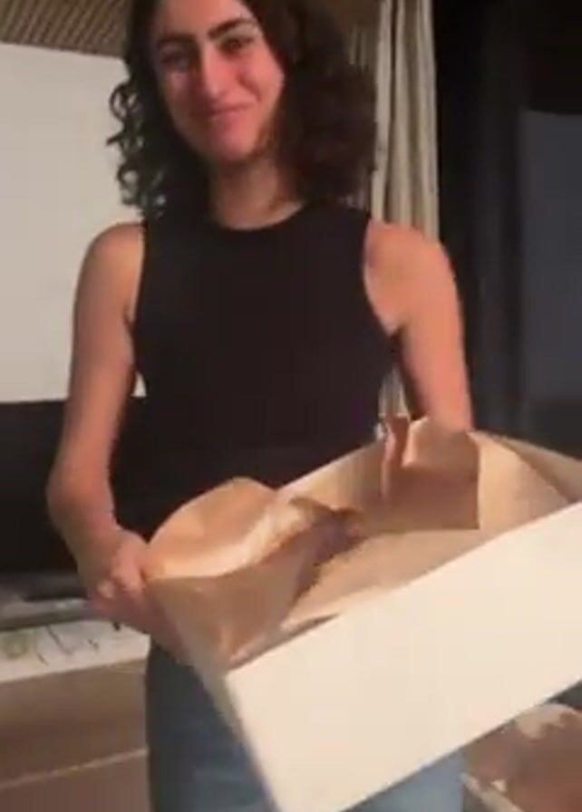 A young woman with curly dark hair, wearing a black tank top and blue jeans, holds a white cardboard box in her hands and smiles at the camera. She opens the box to reveal a brown paper bag. Inside the bag is a large pastry or tart, mostly yellow with a stripe of dark brown topping. The scene takes place indoors, in a living room setting with a TV and a glass table in the background. The camera follows the woman as she reveals the contents of the box.