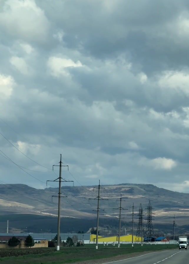 The camera looks through a car windshield as it travels along a multi-lane asphalt road on a cloudy day. Power lines and utility poles are visible along the right side of the road, with a distant hill range in the background. A few cars are driving on the road, including a white semi-trailer truck. Patches of grass and some low buildings are visible between the road and the utility poles. The sky is filled with heavy, grey clouds, obscuring the sun.