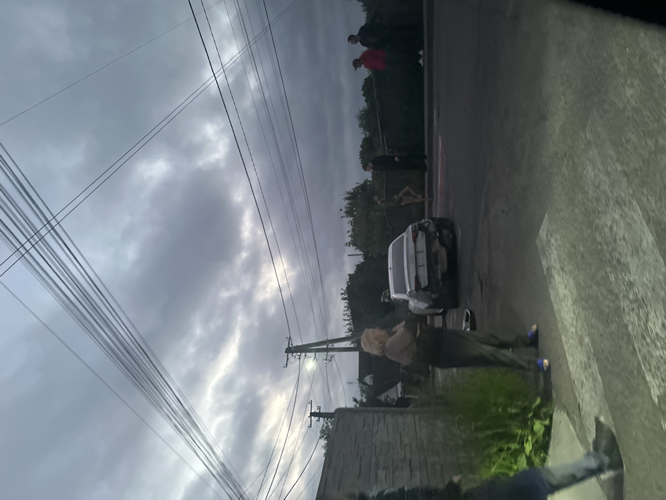 The scene is a residential area in Petropavlivska Borshchahivka, Ukraine, with a gray sky and overcast conditions. There are numerous power lines running across the frame. A white sedan is parked on the side of the road. The rear bumper and taillights are damaged. There are four individuals standing in front of the car, a woman in a long-sleeved shirt, a man in khaki shorts, a man in a dark shirt, and two men in the distance. The woman is standing with her arms crossed and looking at the camera. The man in khaki shorts is looking at the car. The man in the dark shirt is looking down at the ground. The two men in the distance are looking towards the car. The car is on a paved street and there is a concrete curb and a small patch of green grass along the road. The ground is marked with a crosswalk. There is a gray concrete wall in the foreground. There are a few buildings visible in the distance.