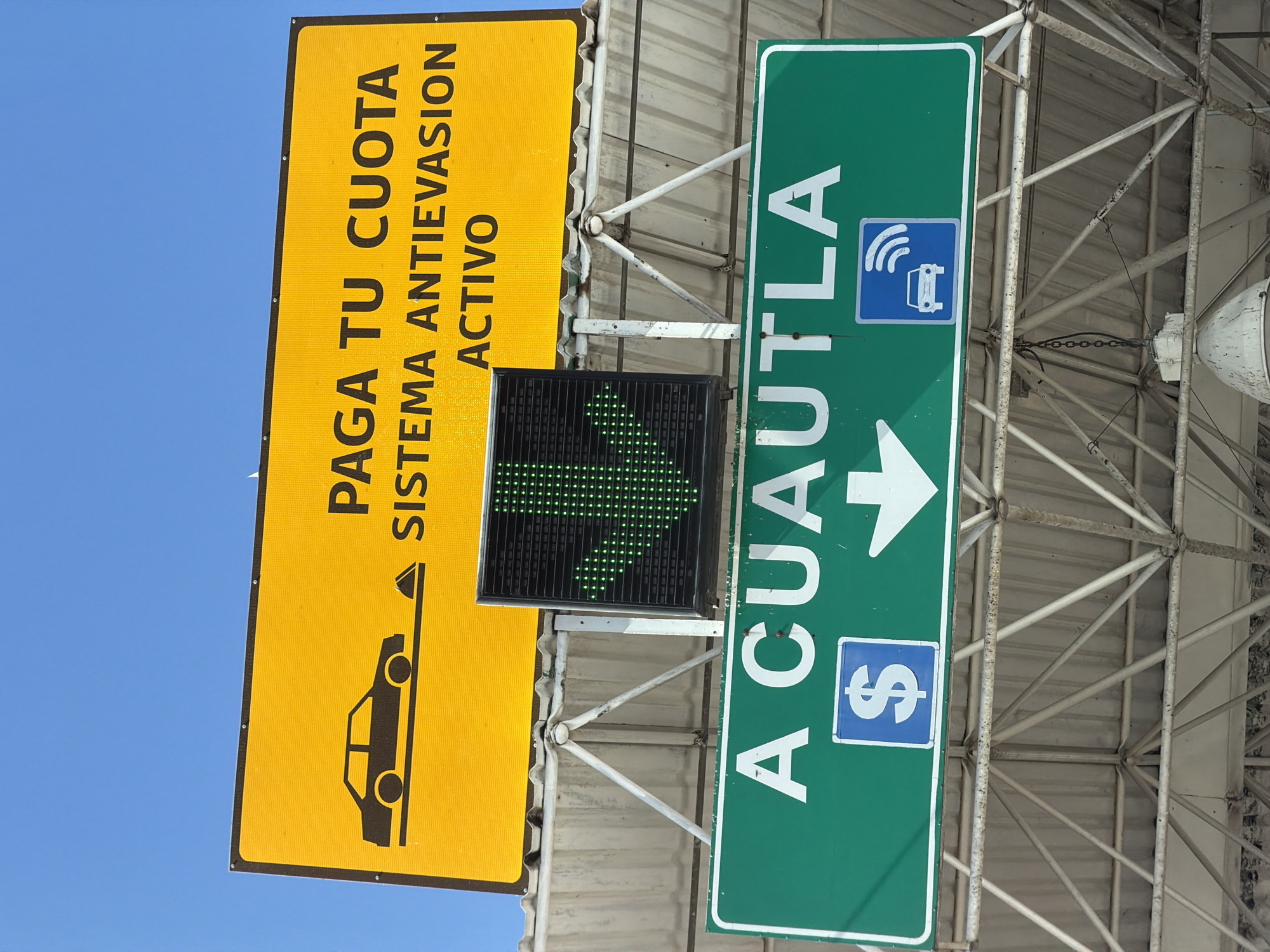 - "The image captures an upward-angled view of an overhead road sign structure at a highway toll plaza or entrance, located in Metepec, Mexico, under a clear blue sky" by FM-HG5o13, licensed under CC BY 4.0