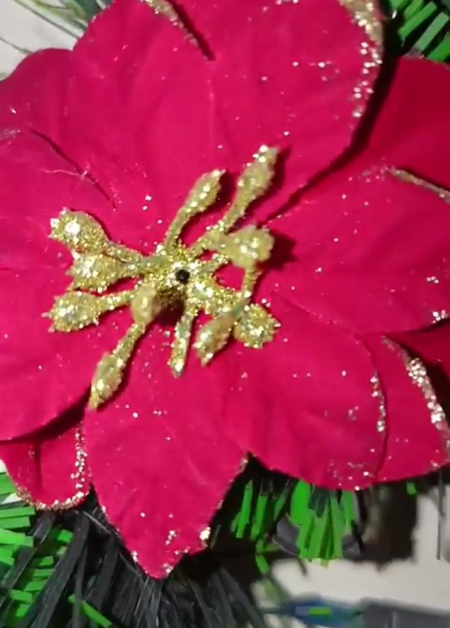 star-shaped Christmas wreath hanging on a white wall. The wreath is made of green garland and decorated with red poinsettia flowers with gold centers and red berries. A string of multi-colored Christmas lights is wrapped around the wreath and extends out to form the points of the star. A wailing sound, possibly from a cat, is heard in the background. The camera zooms out to show the entire wreath.