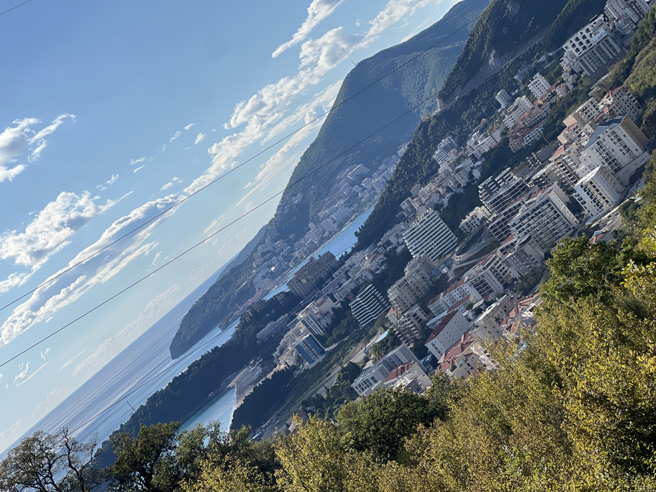 A high-angle, oblique photograph, significantly tilted to the right, captures a sunny coastal city identified as Čučuci, Montenegro