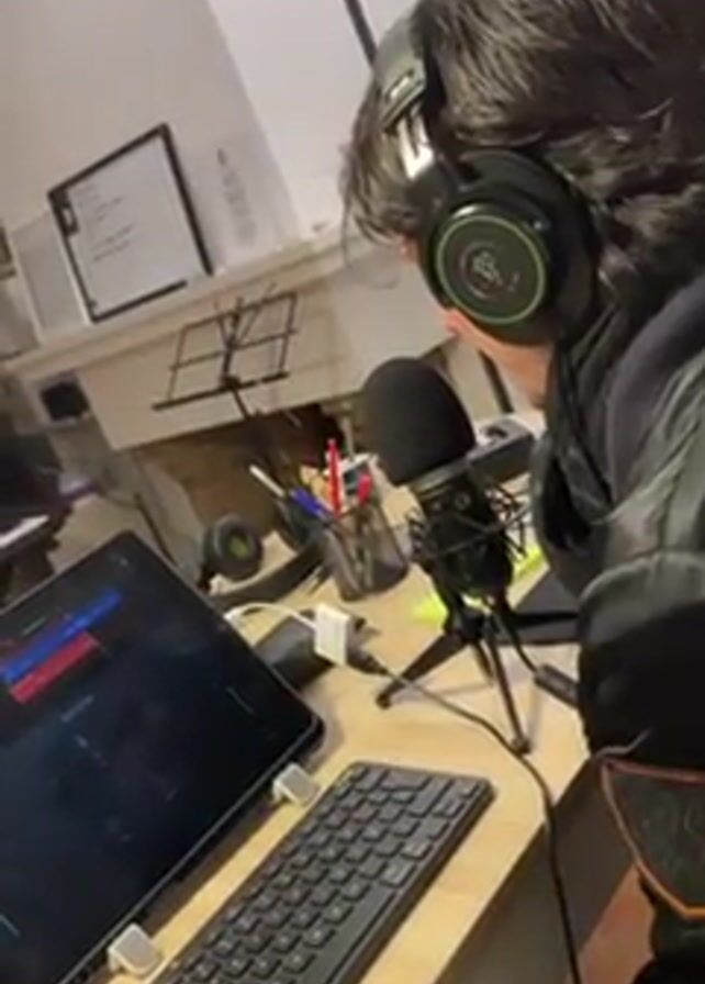 A man is sitting at a desk facing a microphone. He has dark hair and is wearing headphones. He's wearing a black jacket and facing a microphone on a tripod. In front of him are a tablet, a keyboard, and other office items. He appears to be recording or speaking into the microphone. Behind him is a fireplace, a white board, and other office items. The scene suggests a home recording studio or workspace.