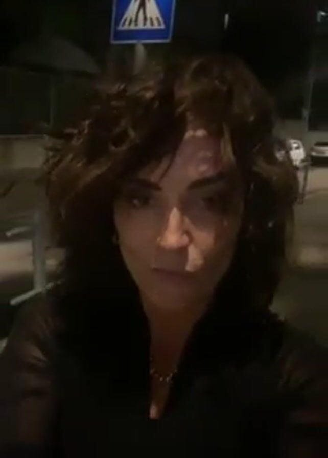 A woman with shoulder-length, wavy dark hair, wearing a black top and a gold necklace, looks at the camera. She is standing outside at night, with streetlights illuminating her face and the surrounding area. In the background, there's a pedestrian crossing sign, a metal fence, parked cars, and buildings. The camera appears to be hand-held, causing slight movement.