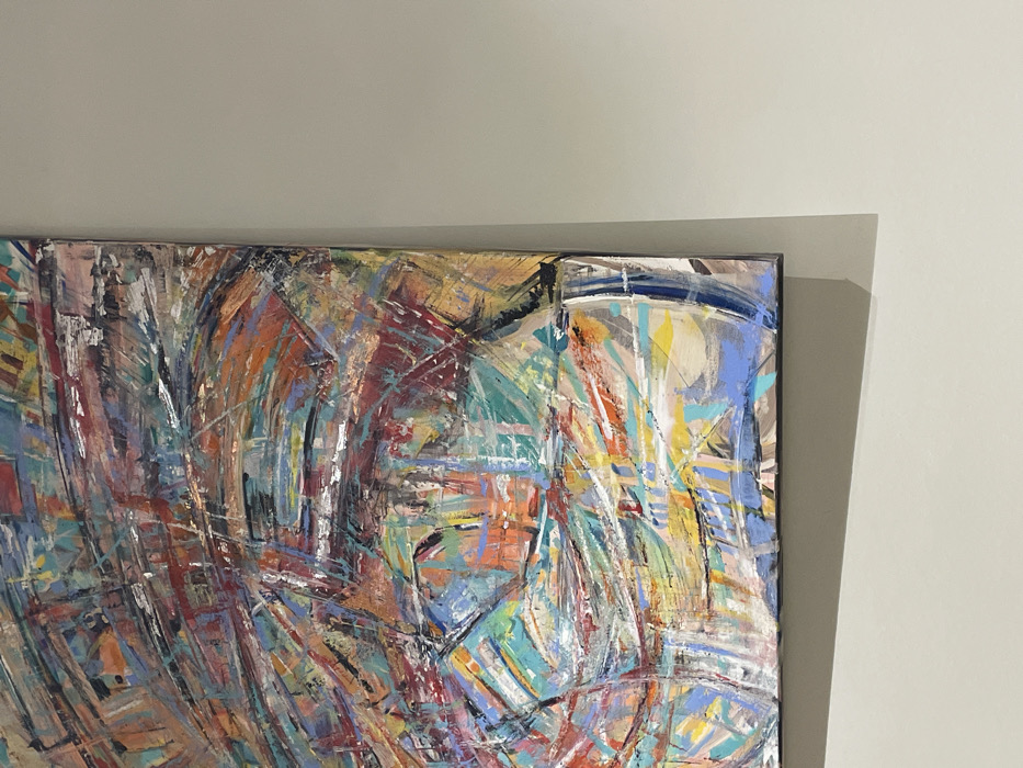 A framed abstract painting with an intense blend of colors: red, orange, blue, yellow, and white. Thick strokes and lines create a dynamic composition. The artwork hangs on a pale, neutral wall. The painting's texture is apparent, with visible brushstrokes enhancing its layered appearance. The top corner of the painting meets the wall at an angle, allowing a shadow to cast onto the wall surface.
