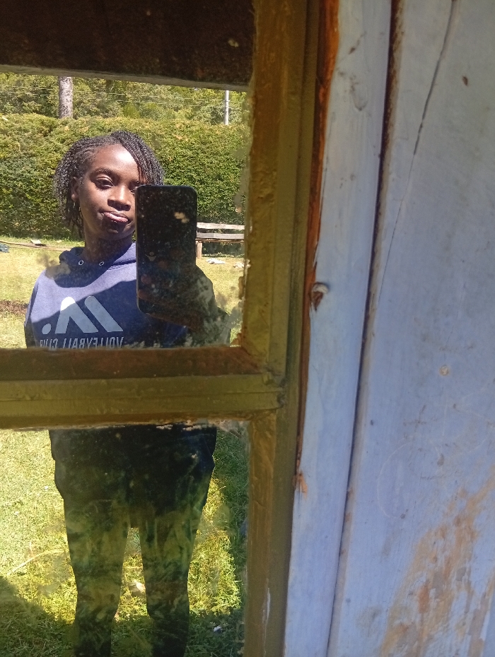 This scene is located in the city of Shamenei, Kenya. An outdoor image depicts the reflection of a young Black female in a dirty or smudged glass surface, possibly a window or mirror. She has dark, braided hair and is wearing a dark blue hooded sweatshirt with white text, partially legible as "VOLLEYBALL CLUB," inverted due to the reflection. She holds a dark-colored smartphone with her right hand, positioned in front of her face, appearing to take a selfie. Her lips are slightly pursed. The reflected background reveals a bright, sunny outdoor environment with green grass in the foreground, dense green hedges or bushes further back, and a tall tree trunk visible on the upper left. A light-colored wooden bench or picnic table is partially visible behind the hedge on the right. The glass is set within a weathered, dark-colored wooden frame. To the right of the frame, a section of a light blue, heavily weathered wooden structure, possibly a wall or door, is visible with peeling paint and exposed wood grain.