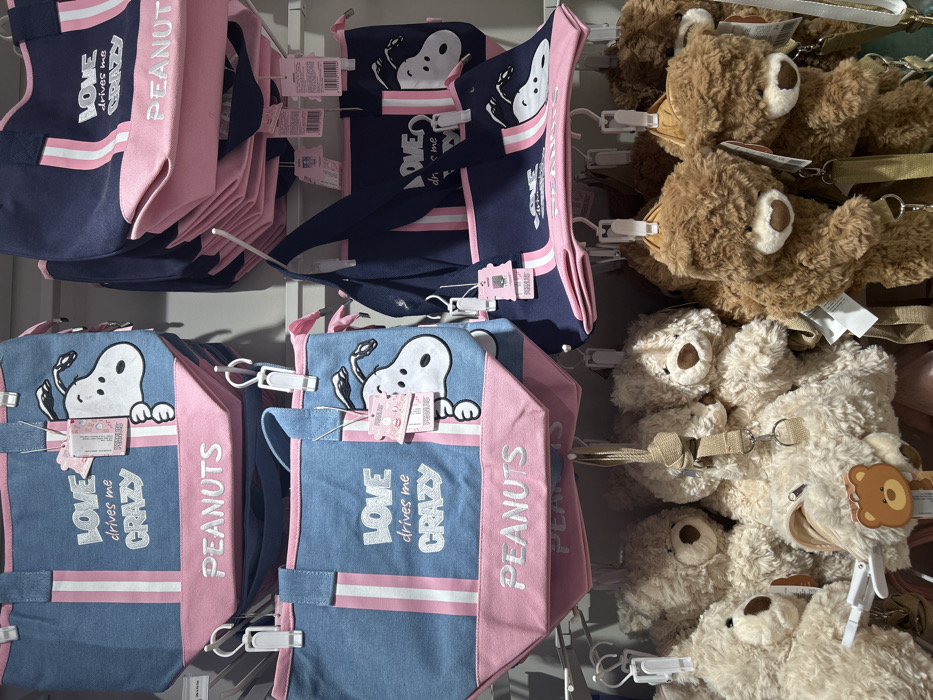 A close-up shows various items hanging on a retail display. The merchandise includes a set of blue and pink bags featuring the Snoopy character and the phrase "Love Drives Me Crazy" and the text "Peanuts". Alongside the bags are plush teddy bears in both brown and cream colors, also hanging from the display. The items appear to be new and available for purchase.