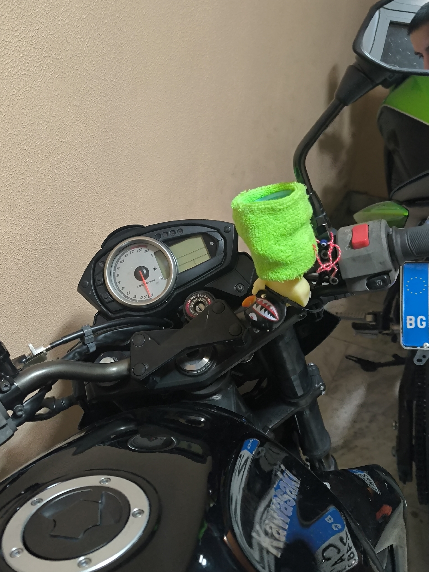 The scene displays a close-up of the front section of a black motorcycle, likely a Kawasaki, parked indoors against a light brown, textured wall. The motorcycle's instrument cluster is visible, featuring a tachometer with a red needle indicating approximately 2,700 RPM, a fuel gauge, and a digital display. A bright neon green fuzzy sock covers the front brake fluid reservoir. Attached below the sock are a small yellow, possibly rubber, figure and a black keychain depicting a shark head with prominent teeth. Red string or wire is tied to the right handlebar controls, which include a red toggle switch. A partial Bulgarian license plate, displaying the "BG" country code on its blue strip, is visible near the handlebars, indicating the vehicle is registered in Bulgaria. The reflection in the motorcycle's right rearview mirror shows the upper portion of a person's face, specifically the eyes and forehead, along with a partial view of an interior window or door frame. The floor is dark and appears to be a hard surface. A tire and frame of another vehicle, potentially a bicycle or another motorcycle, are partially visible in the background to the right. The specific location within the city of Sofia cannot be determined from this image, as the setting is an enclosed, non-descript indoor space such as a garage or private parking area.