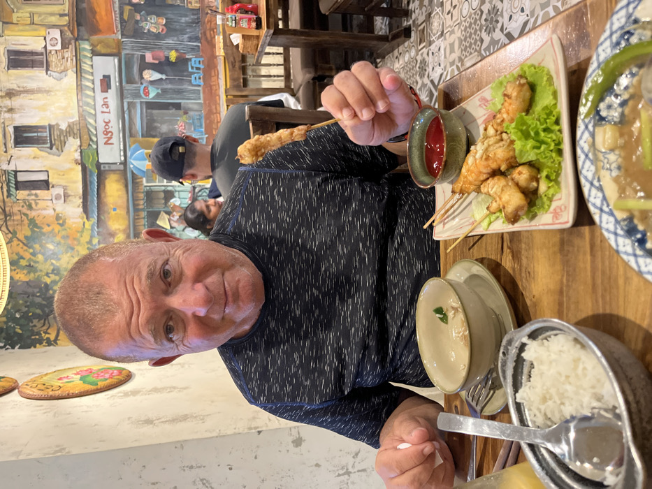 A middle-aged, light-skinned male individual with short hair and a subtle stubble is seated at a rustic wooden table in a restaurant, looking directly at the camera with a slight smile. He is wearing a dark t-shirt with a faint striped pattern. His right hand holds a single food skewer with a piece of grilled protein towards the viewer. On the table in front of him are several dishes: a rectangular plate featuring multiple skewers of grilled shrimp and other meats on a bed of lettuce, accompanied by a small bowl of red dipping sauce; a metal bowl containing white rice with a spoon; and a small bowl of soup or sauce on a saucer. A partially visible plate with additional food and a green chili is in the foreground lower right, and a glass of a light yellow beverage is on the far left. The restaurant's background wall features a vibrant mural depicting a traditional street scene, characteristic of Hà Nội, Vietnam, complete with multi-story buildings, shopfronts, and a visible sign reading "Ngọc Lan." Other patrons are dimly visible in the background, including one individual wearing a dark baseball cap. The flooring is patterned with decorative tiles.