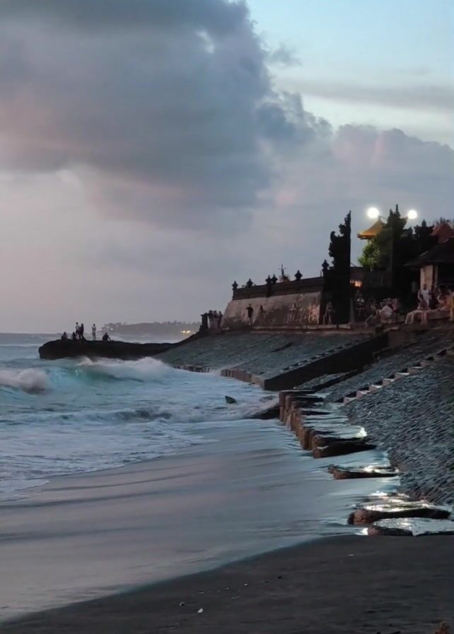beach scene at twilight, with large waves crashing onto the shore. On a rocky outcrop to the left, a group of people are standing and looking out at the ocean. Adjacent to the beach is a wall lined with more people. On top of the wall are buildings and lit towers, and the sky overhead is filled with heavy, dark clouds. The beach itself is dark sand, and the water is a mix of blue and white due to the crashing waves.