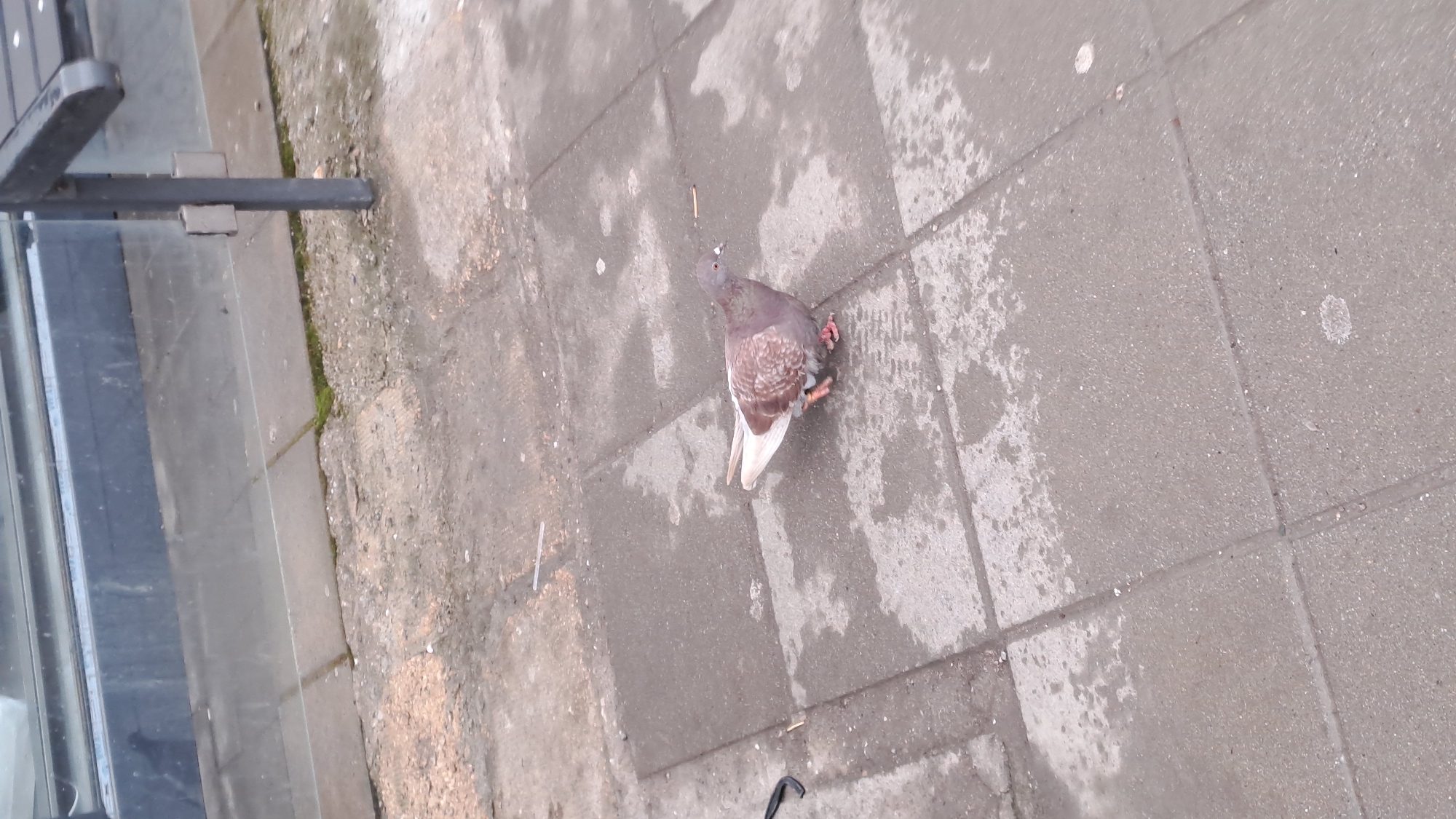 - "The image presents an urban outdoor scene in Varna, Bulgaria, depicting a single rock pigeon (Columba livia) on a wet, grey concrete paved surface" by FM-sWxdw1, licensed under CC BY 4.0