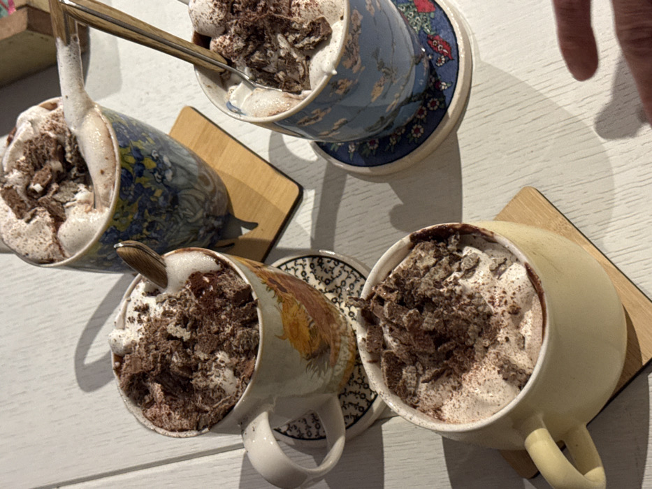Four mugs of hot chocolate topped with whipped cream and chocolate shavings sit on coasters