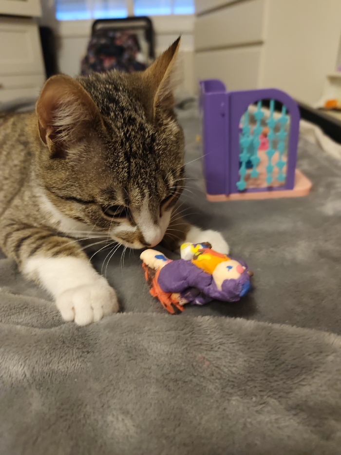 A tabby kitten with white paws lies on a gray blanket, intently sniffing a lumpy clay figure. The figure is colorful, with purple, orange, and yellow components. Behind the kitten, out of focus, is a small purple and pink toy structure with a barred window. The backdrop consists of a white dresser and a window covered by sheer blinds.