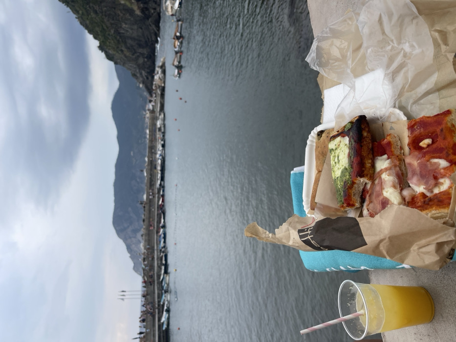 The image depicts a first-person perspective of a casual meal set at the harbor in Vernazza, Italy