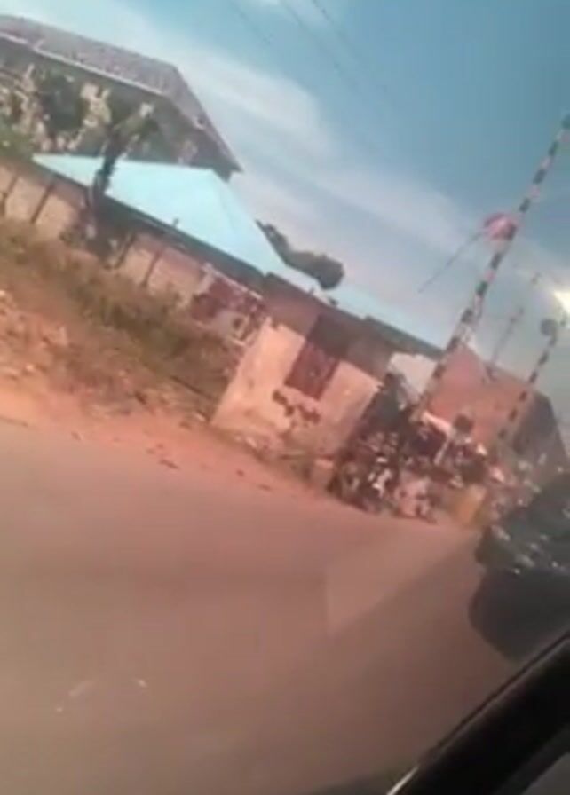 view from inside a car, looking out the side window at a street scene. A black car is passing by on the road outside. The road has a dirt shoulder and there are buildings and structures along the side of the road. A black and yellow striped traffic arm is also visible on the side of the road.