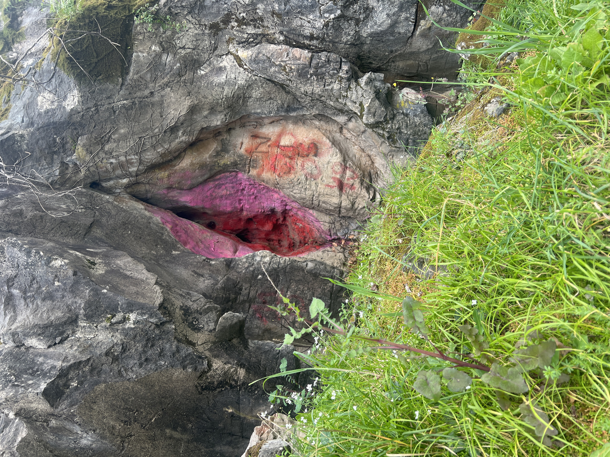 This image depicts a natural rock formation, likely a cliff face or large boulder, situated in Đuraševići, Montenegro. The central feature is a vertical fissure in the rock, approximately centrally located, which has been extensively painted with bright pink and red pigment, creating an appearance suggestive of a vulva. To the immediate right of this painted fissure, a lighter-colored section of rock displays additional red painted markings, appearing as abstract symbols or figures. The surrounding rock is predominantly dark grey, rough, and fractured, with areas of moss and small plant growth adhering to its surface. The lower foreground is covered with dense, vibrant green grass and various herbaceous plants, including some with small white flowers. A plant with broad, dark green leaves and a reddish stem is visible in the lower-left. No individuals or active interactions are present in the scene.