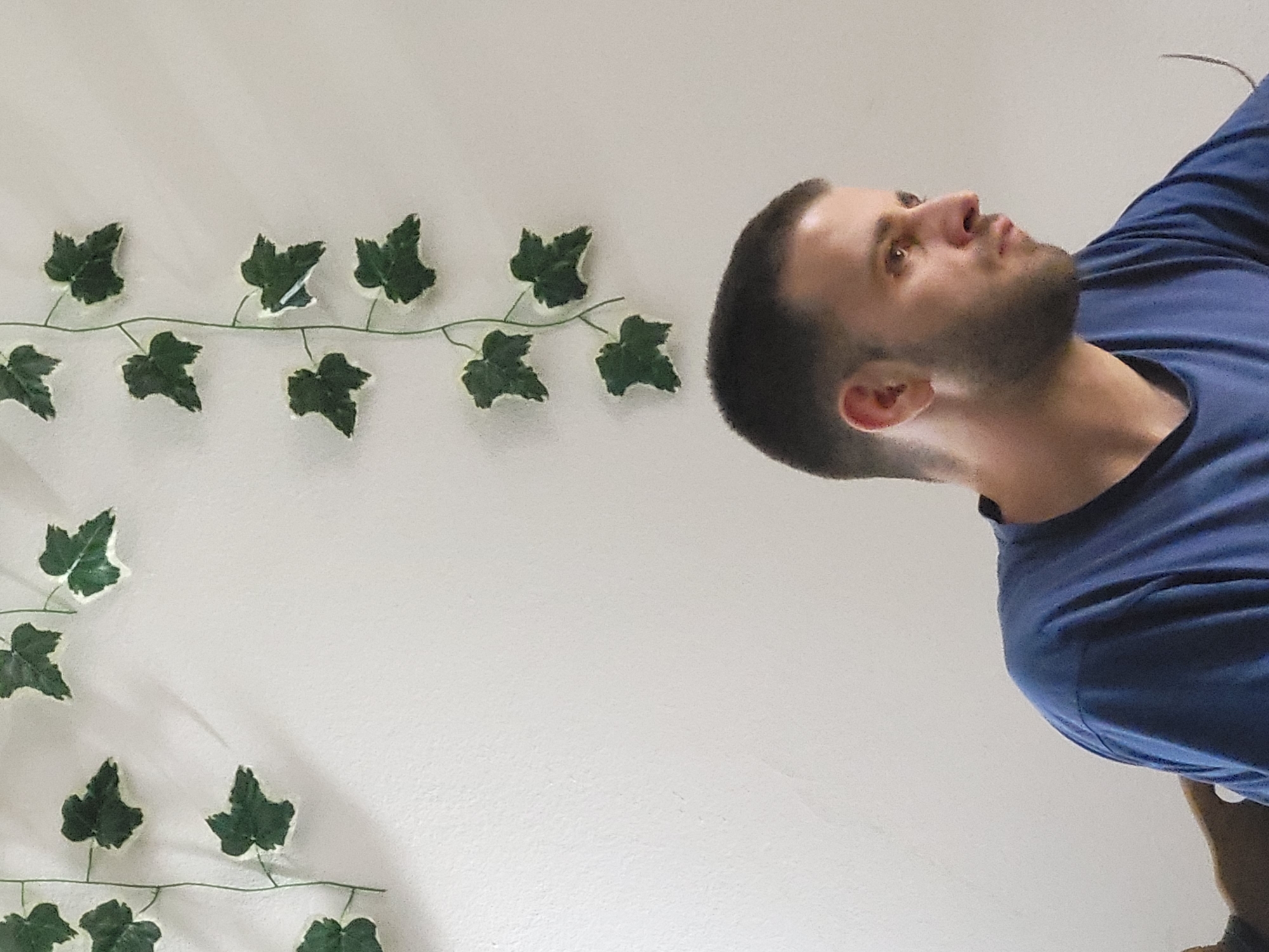 A male individual is depicted in profile, facing right, positioned in the lower center of the frame against a plain white, textured wall. He has short, dark hair with faded sides and visible stubble on his jawline and chin. His eyes are directed downward and to the right. He wears a plain blue, short-sleeved t-shirt. Behind his left shoulder, a dark brown object, potentially a wooden chair back, is partially visible. Two strands of artificial ivy, featuring dark green leaves with lighter, possibly white, edges, are affixed to the upper left and right sections of the white wall. The scene is located in Kragujevac, Serbia.