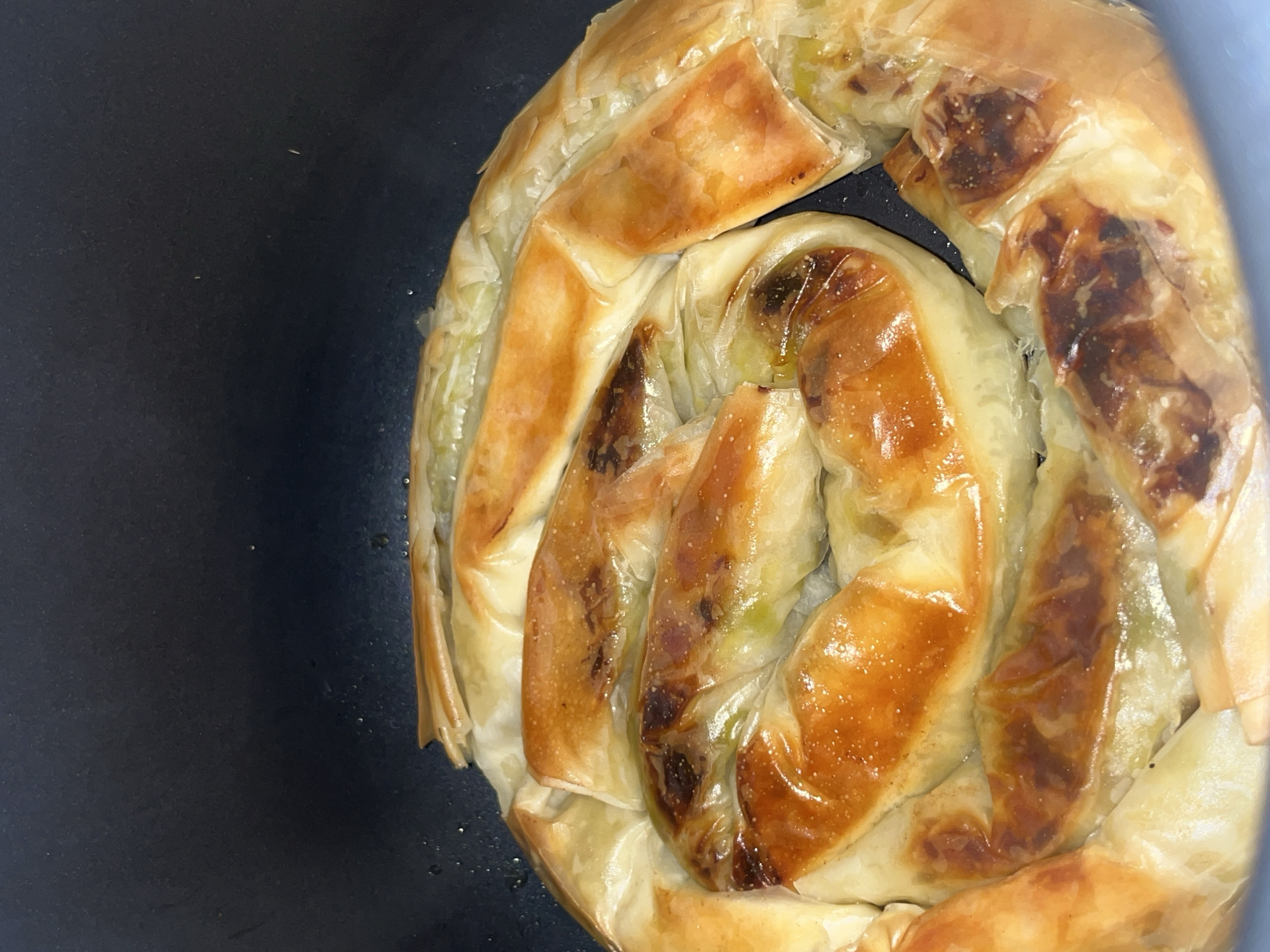 - "circular pastry, possibly a banitsa, on a dark surface" by FM-HHhrs1, licensed under CC BY 4.0