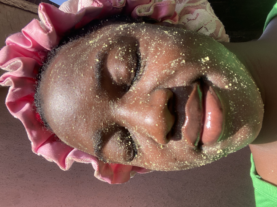 An individual with dark skin is depicted in a close-up, outdoors in Sabon Tasha, Nigeria. Their eyes are closed, and their face is covered with numerous small, yellow-green granular particles, consistent with a facial scrub or mask application. A ruffled, shiny pink cap or bonnet is worn on the head, partially obscuring the hair. A portion of a bright green garment is visible at the lower left. The scene is illuminated by direct sunlight, casting distinct shadows and highlights, with a reddish-brown wall forming the background on the left and a sliver of blue sky visible at the upper right.