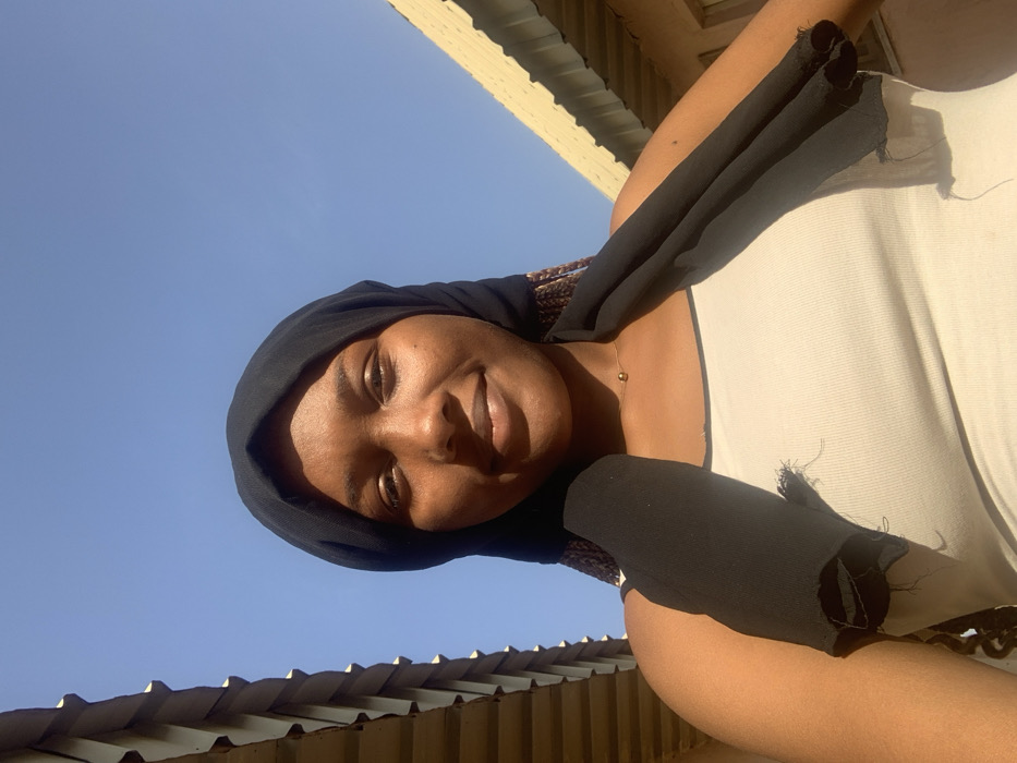 A woman smiles, looking down at the camera. She wears a black headscarf, braids visible at the edge. Her skin glows in the sunlight. She wears a cream-colored sleeveless top and a delicate gold necklace. The backdrop includes a clear blue sky, a corrugated metal roof, and a building facade in the distance. The photo is taken from a low angle, creating an upward perspective.