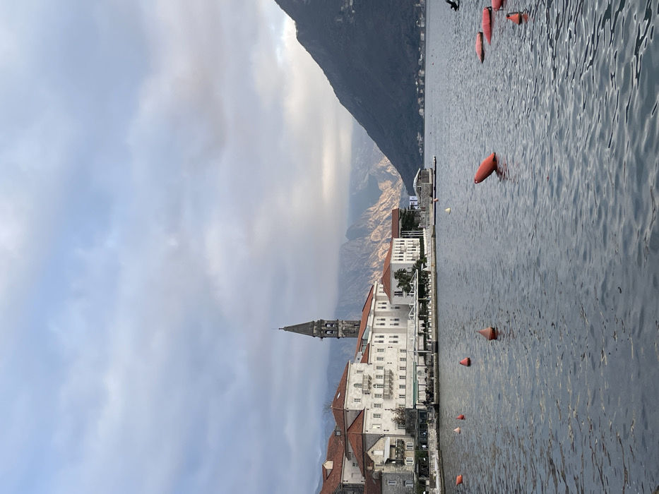 The image displays a panoramic view of the Perast waterfront in Montenegro under an overcast sky. The foreground is dominated by a body of water, likely a bay, exhibiting gentle ripples across its surface. Numerous orange-red, conical buoys are visible, primarily in the lower right and central-left areas of the water. Along the midground waterfront, a sequence of multi-story buildings with light-colored facades, possibly stone or stucco, and red tile roofs lines the shore. Several buildings feature decorative balconies with railings. A prominent, tall grey stone bell tower with a pointed spire rises behind the central cluster of buildings. At the base of these structures, multiple establishments feature outdoor dining areas, indicated by white or light-colored awnings covering tables and chairs. Indistinct figures are visible seated at some of these tables. Further along the right side of the waterfront, a smaller, white building with a dark roof abuts a small pier extending into the water. The background features steep, dark green and grey mountains rising abruptly from the water on the right side of the frame. In the far distance, additional mountain ranges are partially obscured by atmospheric haze or low-lying clouds. The sky is predominantly overcast with grey and white cloud formations, with a lighter section appearing in the upper right.